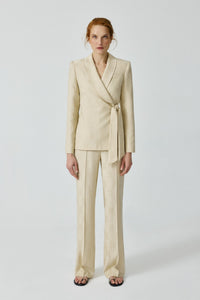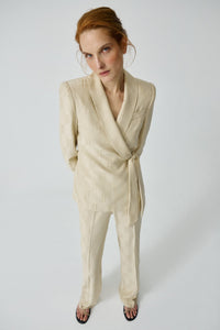 Esta reversión del icónico N01 se estrena en un nuevo tejido: un jacquard crudo con el monograma de la firma integrado de forma sutil. La blazer mantiene el cierre con lazada lateral y la estructura envolvente, mientras actualiza la silueta con una caída más relajada y sofisticada. Perfecta para invitadas de día, celebraciones especiales o para elevar un look neutro con un punto de identidad reconocible.
