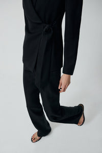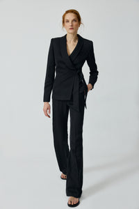 Este pantalón flare en lino satén negro con diseño fluido estiliza visualmente gracias al tiro medio y la pierna ligeramente acampanada, aportando movimiento y estructura a partes iguales. Un básico elevado que funciona tanto con su blazer a juego como combinado con piezas más desenfadadas.