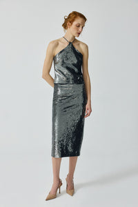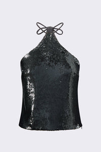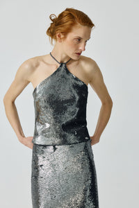 Top halter confeccionado en una delicada lentejuela gris plomo. Cada detalle en su confección irradia elegancia y refinamiento, asegurando un estilo impecable.
