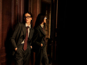 La colección mantiene intacta su esencia a través de una cuidada selección de materiales como la lana fría, trabajada en tonos sobrios pero de gran impacto: negro, azul y gris. La raya diplomática, uno de los estampados clásicos por excelencia, refuerza esa conexión con la sastrería más tradicional.