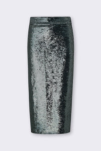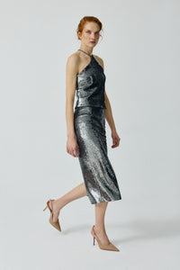 Confeccionada en lentejuela elástica gris plomo, esta falda midi se adapta al cuerpo realzando la silueta sin renunciar a la comodidad. La abertura trasera permite moverse con soltura, mientras que su diseño limpio la convierte en una prenda perfecta para noches especiales. Disponible el top a conjunto en lentejuela gris plomo para un total look infalible.